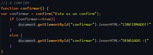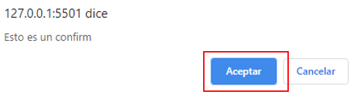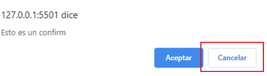 Muestra una ventana con las opciones de aceptar o cancelar. Estas opciones pueden almacenarse en una variable: si la opción escogida es aceptar, devuelve un valor de true; si la opción escogida es cancelar, devuelve un valor de false.