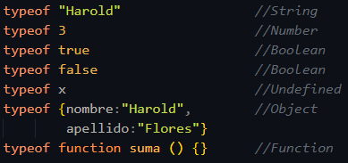 Devuelve el tipo de dato de una variable o de una función. Puede devolver los valores: string, number, boolean, undefined, function y object.