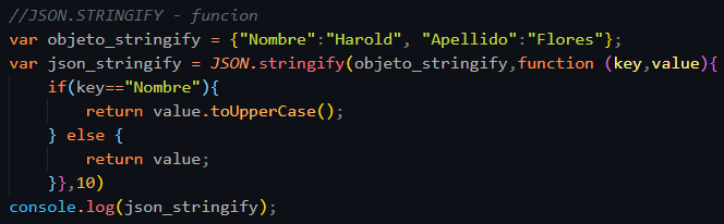 Transforma un objeto javascript en un string. Esta función recibe tres parámetros: el objeto, una función o array y los espacios antes de cada elemento. La función es opcional al igual que los espacios.